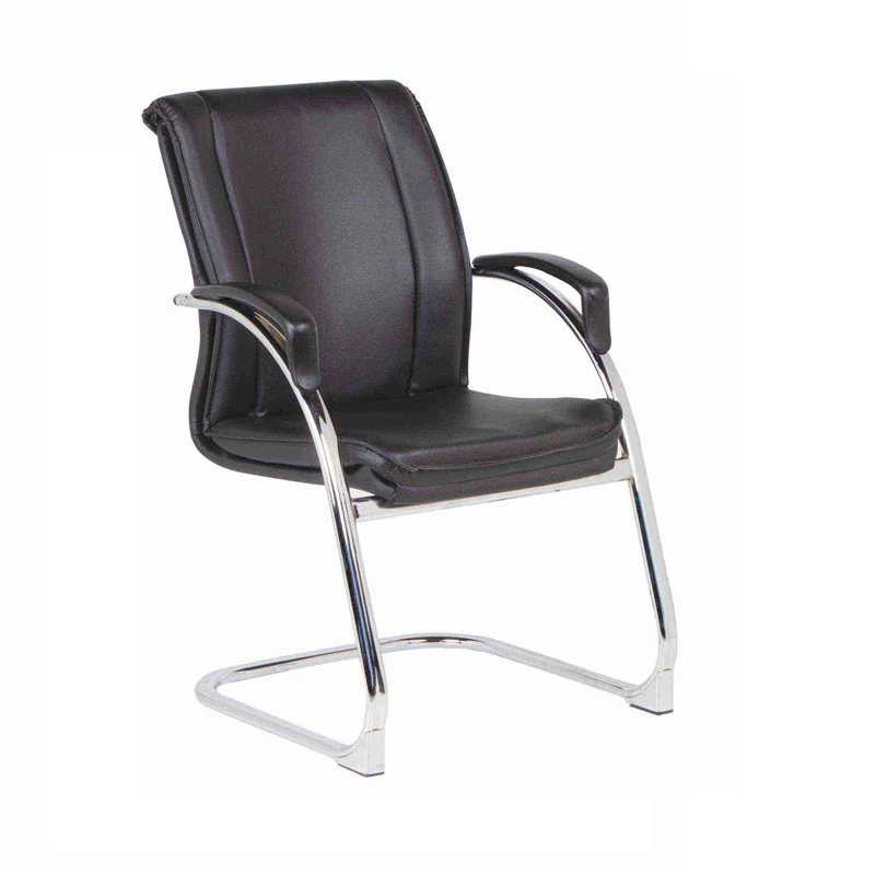 صندلی کنفرانسی با طراحی ساده و نشیمن بسیار راحت مناسب برای تمام محیط های اداری. پایه صندلی پروفیل فولادی با ابکاری کروم و روکش صندلی چرم دوخته شده پی یو و رویهی دسته های صندلی انتگرال نرم قالبی