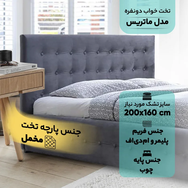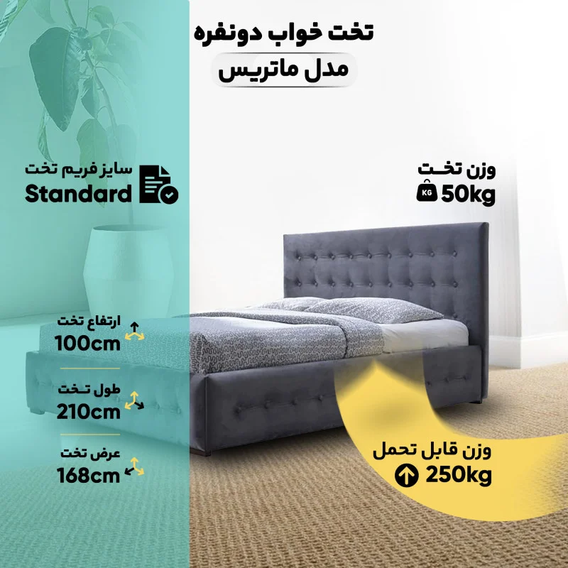 خستگی یک روز کاری و پر مشغله قطعا با یک خواب راحت از بین میرود. تخت خواب دو نفره مدل ماتریس سایز 160×200 سانتیمتر این قابلیت را دارد شما بتوانید با همسر خود یک خواب پر از آرامش را تجربه کنید این محصول دارای بدنه تمام پارچه است که به سبک چستر بوده و پایههای آن چوبی است. جنس فریم این محصول پلیمر و ام دی اف است و دارای کیفیت بالایی است که از مقاومت خوبی برخوردار است. نوع تشک این محصول معمولی بوده و سایز فریم تخت آن استاندارد است. جنس پارچه این محصول از مخمل است که از کیفیت و دوام بالایی برخوردار است. تخت خواب دو نفره مدل ماتریس سایز 160×200 سانتیمتر قابلیت تحمل وزن تا 250 کیلوگرم را دارد و شما میتوانید با هر وزنی که هستید خوابی خوش را روی این تخت تجربه کنید.