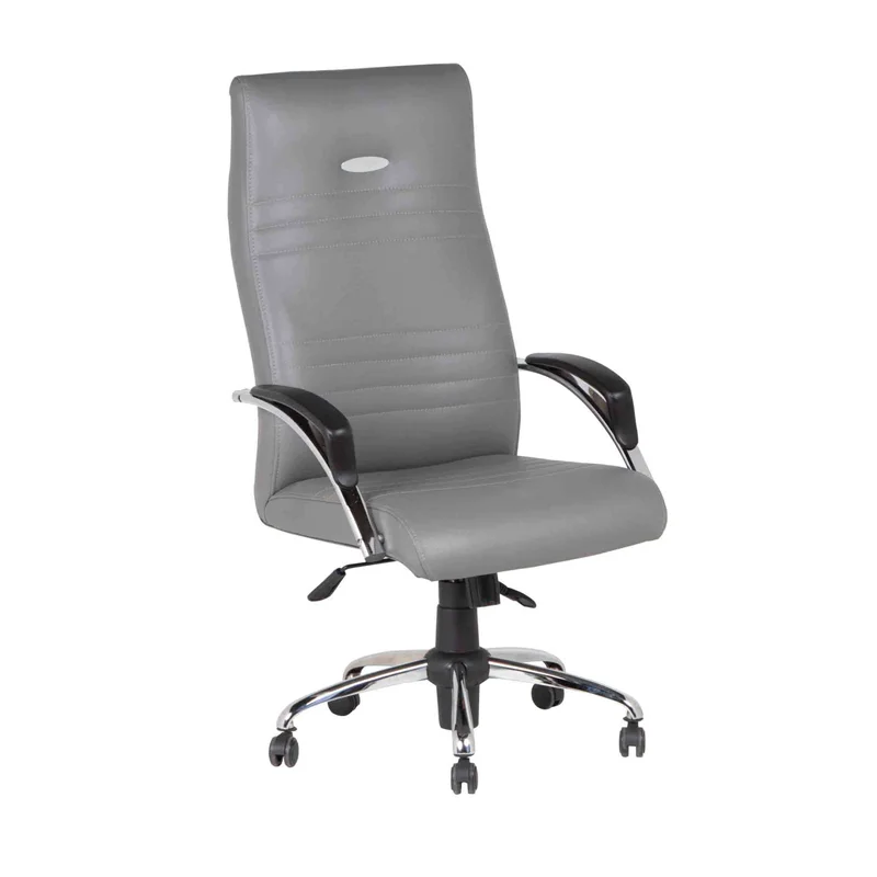 صندلی مدیریتی با طراحی مدرن و ارگونومیک. پایه پنج پر فولادی ابکاری شده و چرخ های ژله ای بدون صدا.مکانیزم صندلی دو دسته کلاجی با امکان قفل شدن در هر حالتی.روکش صندلی چرم دوخته شده پلی اورتان بدون امکان پوست پوست شدن. جک گازی 10 سانتی متری. دسته های فولادی با ابکاری کروم با رویه ی پد نرم انتگرال