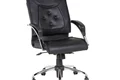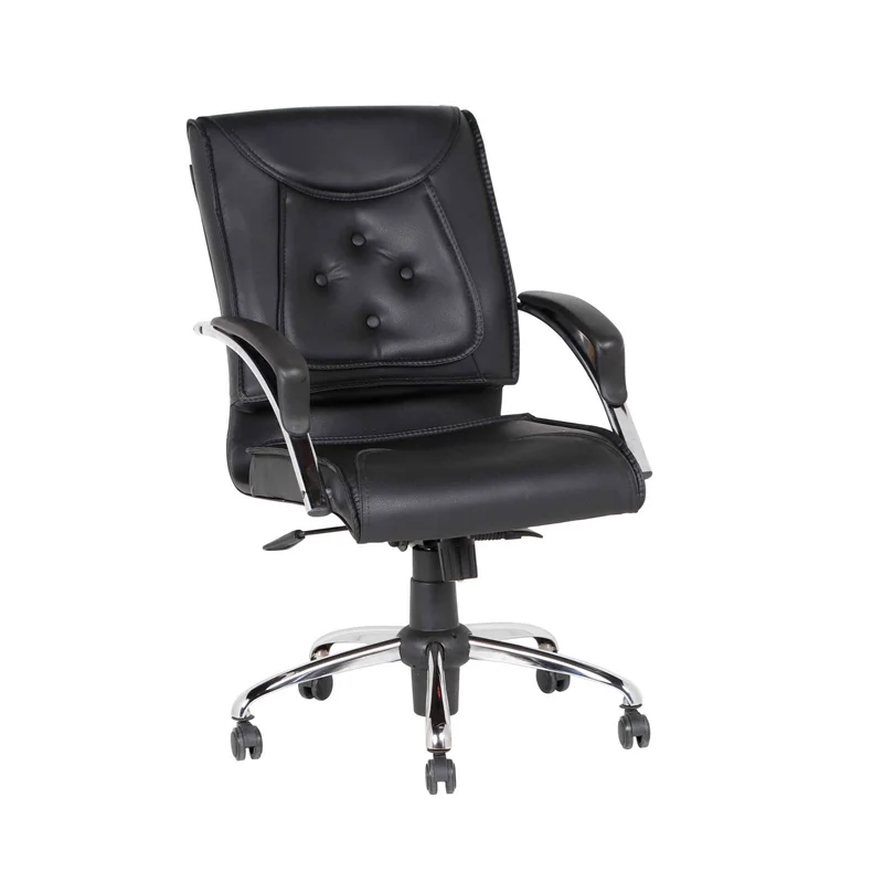 صندلی اداری با طراحی مدرن و ارگونومیک. پایه پنج پر فولادی ابکاری شده و چرخ های ژله ای بدون صدا.مکانیزم صندلی دو دسته کلاجی با امکان قفل شدن در هر حالتی.روکش صندلی چرم دوخته شده پلی اورتان بدون امکان پوست پوست شدن. جک گازی 10 سانتی متری. دسته های فولادی با ابکاری کروم با رویه ی پد نرم انتگرال