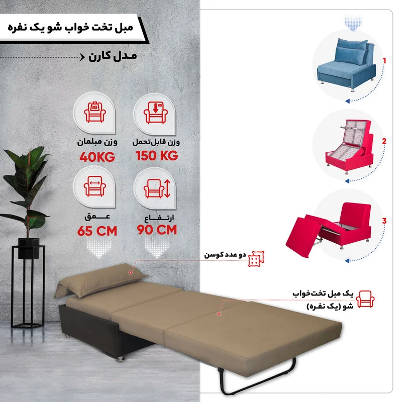 مبل تخت خواب شو یک نفره کارن دارای تشکی از جنس اسفنج با دانسیته بالا است، لولههای به کار برده شده در کف و پایهها تماماً آبکاری شده است که استحکام و دوام خوبی به آن بخشیده است و همچنین برای خوابی راحت کاملا مناسب است. طراحی شیک و مدرن مبل کارن مکمل هر سبک دکوری است و مطمئناً زیبایی کلی فضای شما را افزایش میدهد. مبل تخت خواب شو کارن راهحلی عالی برای کسانی است که بهدنبال گزینهای راحت و همهکاره راحت برای نشستن و خواب هستند. این مبل تختخواب شو میتواند در طول روز فضایی راحت برای نشستن یا استراحت کوتاه وسط روز فراهم کند و شبها به یک تخت راحت برای خوابی خوب تبدیل شود. مبل تختخواب شو دارای مکانیزم سادهای است که به شما این امکان را میدهد تا تنها در چند ثانیه آن را به تخت تبدیل کنید و برای مهمانان غیرمنتظره یا کسانی که میخواهند از فضای کوچک نهایت استفاده را ببرند، گزینهای ایدهآل است. با اندازه جمع و جور و طراحی سبک وزن، جابهجایی و نگهداری آن نیز آسان است.
