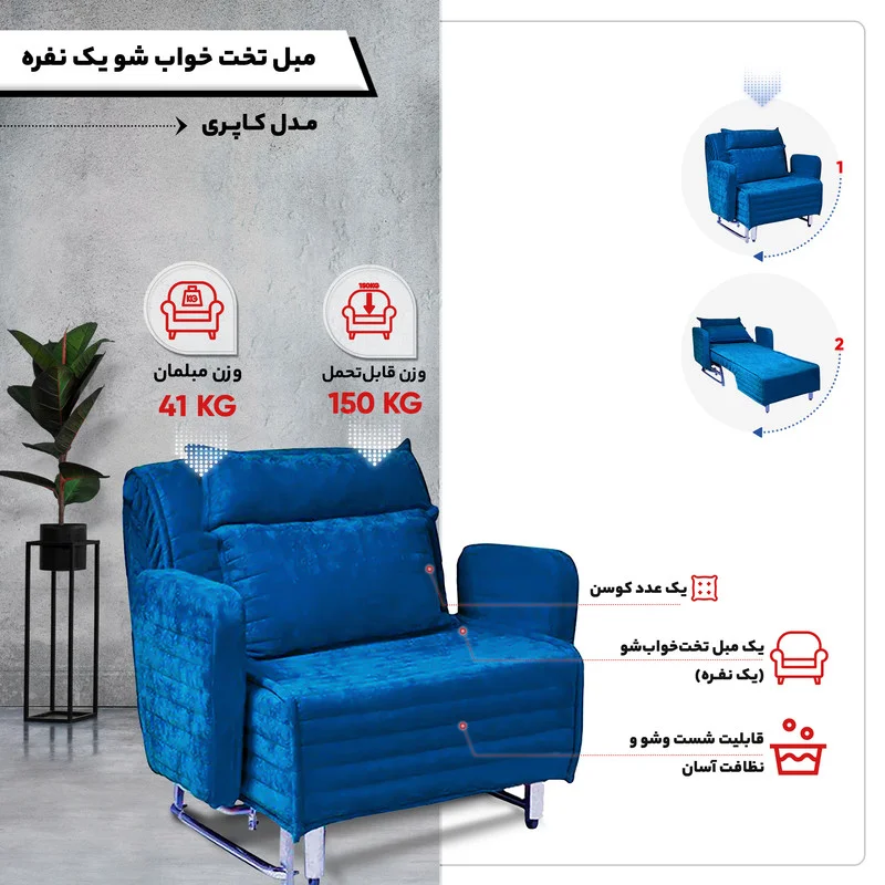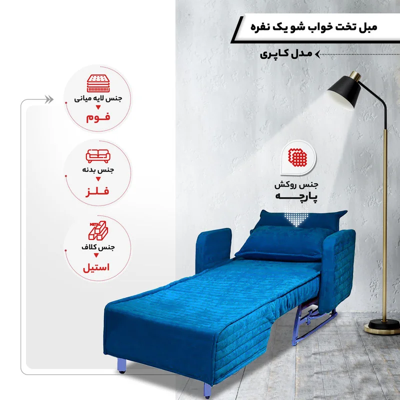 مبل تختخوابشو یکنفرۀ مدل کاپری از اولین و محبوبترین تختخوابشوهایی است که در ایران تولید و عرضه شد. کاپری بهدلیل بازوبستهشدن آسان، وزن کم و مقرونبهصرفهبودنش خیلی زود جای خود را در میان ایرانیان باز کرد. تختخوابشو دیاکو هم از همان بدو امر تا به امروز در پی آن بوده که با مدرنترکردن سازوکار و متریال کاپری، کماکان این مدل را بهعنوان مدلی نوستالژیک حفظ، تولید و عرض کند. مبل تختخوابشو مدل کاپری در کاربری خانگی مناسب اتاق نشیمن و هال پذیرایی است و ازسویدیگر بهدلیل ظریفبودن پشتی و بهطور کلی طراحی ارگونومیکاش، انتخاب مناسبی برای دفاتر اداری و بهویژه هتلها، مراکز درمانی و بیمارستانها بهشمار میرود. عرض تشک این مبل، 80 سانتیمتر است و طول آن 200 سانتیمتر است و ازاینرو فضای قابل قبولی را برای خواب یک فرد بزرگسال فراهم میآورد و در کنار آن، برای منازل کوچک نیز گزینۀ ایدئالی محسوب میشود. داخل این مبل، کلافی فلزی برای استفادۀ بلندمدت تعبیه شده که در نتیجه، ماندگاری بسیار بالای ساختار مبل تختخوابشو را بهدنبال خواهد داشت و استفاده از کفی فوم و توری فلزی بهجای کفی مبلی معمولی به افزایش عمر نشیمن کمک شایانی میکند. پارچۀ بهکار رفته شده در این محصول کیفیت قابلتوجهی دارد و درعینحال میتوان بهسادگی آن را از بدنه خارج کرد و شست. روکش مبل علاوهبر قابل شستشو بودن، قابلیت تعویض نیز دارد و بنابراین در صورت تغییر دکوراسیون منزل میتوان رنگ آن را به رنگی دیگر، منطبق با طراحی جدید، تغییر داد. گفتنی است تختخوابشو دیاکو بههمراه مبل، 1 عدد کوسن همرنگ ارسال میدارد.