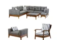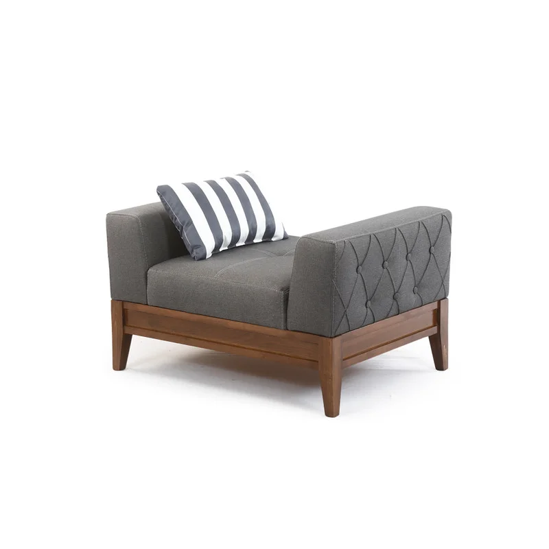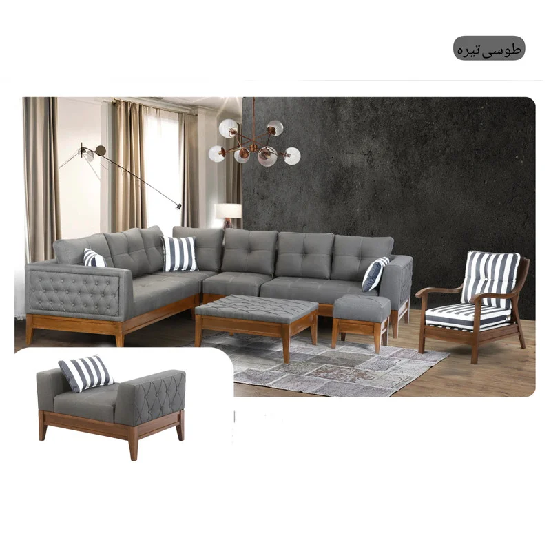 مبل راحتی ال با طراحی جدید و کم جا و تعداد نشیمن بالا ارائه می شود.این ست شامل یک قسمت سه نفره,کنج,یک قسمت دو نفره و تک نفره,یک صندلی تکی چوبی,لاوست و پاف,به همراه جلو مبلی می باشد که علاوه بر تعداد نشیمن بالا,امکان چند مدل چیدمان مختلف را به شما می دهد.مواد اولیه ی مصرف شده در این محصول شامل چوب روس در کلاف,ام دی اف رو کش چوب در پایه ها,اسفنج 35 ویژه در نشیمن و 25 کیلویی در تکیه گاه ها,ویسکوز در کوسن ها و پارچه ی نانو قابل شست و شوی می باشد که باعث ایجاد استحکام مناسب اسکلت مبلمان و راحتی محصول می شود.در زیر اسفنج کار شده در این محصول از فنربندی استفاده شده که باعث انعطاف و دوام بالاتر محصول می شود.همچنین بین پارچه و اسفنج کار شده در این مبل یک لایه لایکو قرار گرفته که از چروک شدن پارچه به مرور زمان جلوگیری می کند.قسمت روی جلو مبلی و کناره های مبل به صورت لمسه می باشد که ظرافت و زیبایی بیش تری را در طراحی اضافه می کند.در مجموع مبل ال لارا با تعداد نشیمن بالا و طراحی خاص،انتخابی ایده ال برای افرادی که به دنبال محصولی بین سبک نئوکلاسیک و راحتی هستند می باشد.