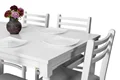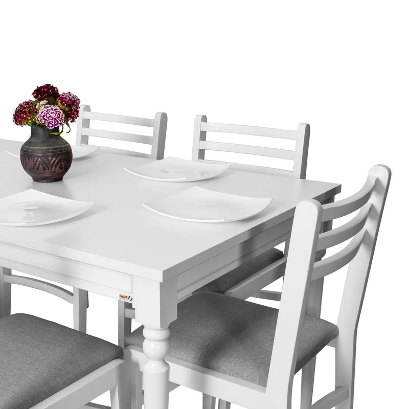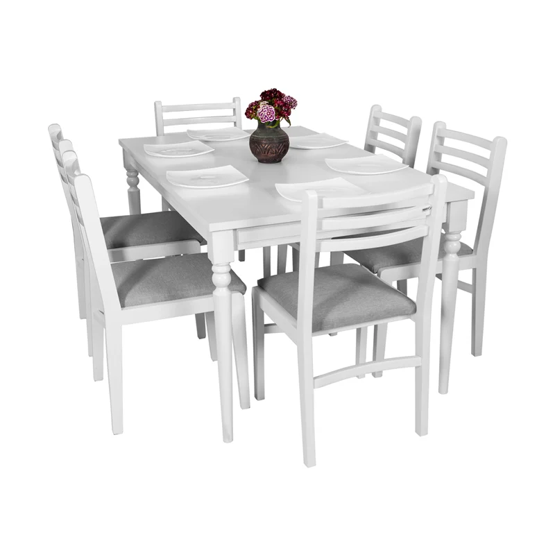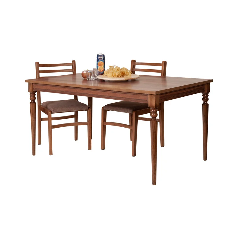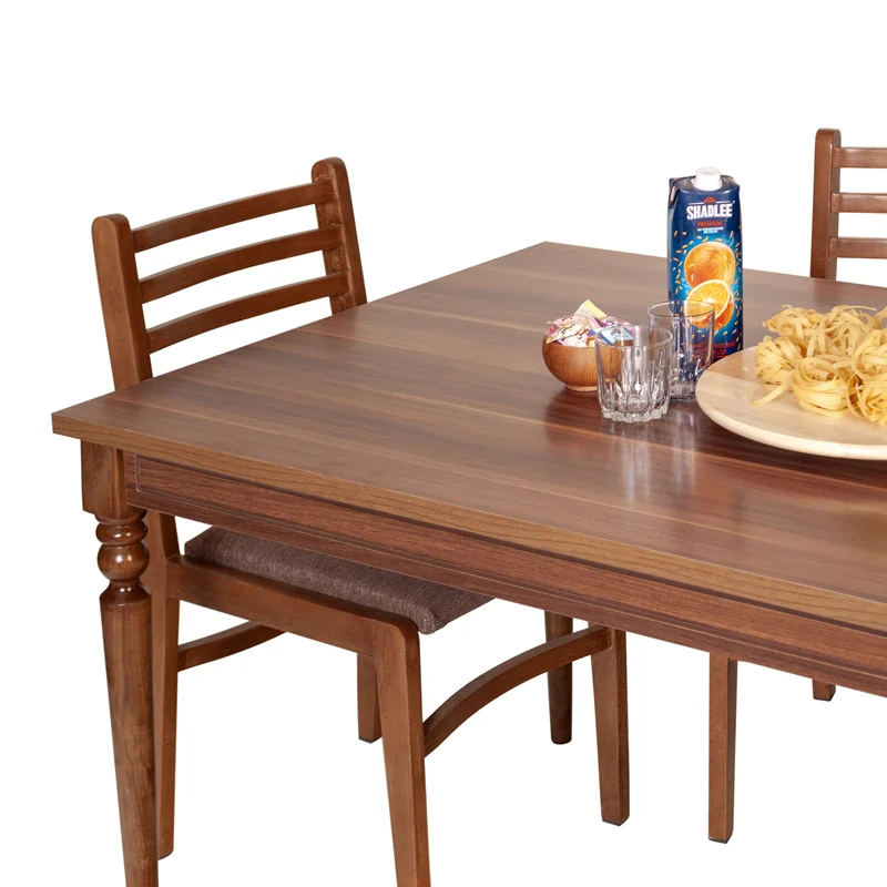 ابعاد ۱۵۰ در ۹۰سانتی متر و ارتفاع ۷۵ سانتی متر مناسب برای استفاده ۶ نفر پایه های میز از چوب روسی است جنس صفحه رویی از MDF درجه یک است، جنس صفحه ملامینه .