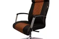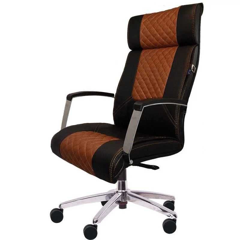 جنس فریم صندلی چوب ورقی هفت لایه با استحکام بالا و نوع پایه فولادی ورقی با آبکاری کروم جنس روکش صندلی چرم پلی اورتان و جنس فوم صندلی ازنوع فوم سرد قالبی با ماندگاری بسیار بالا با جک گازی 10 سانتی متری با مکانیزم دو دسته کلاجی با امکان قفل پشتی صندلی در هر حالتی