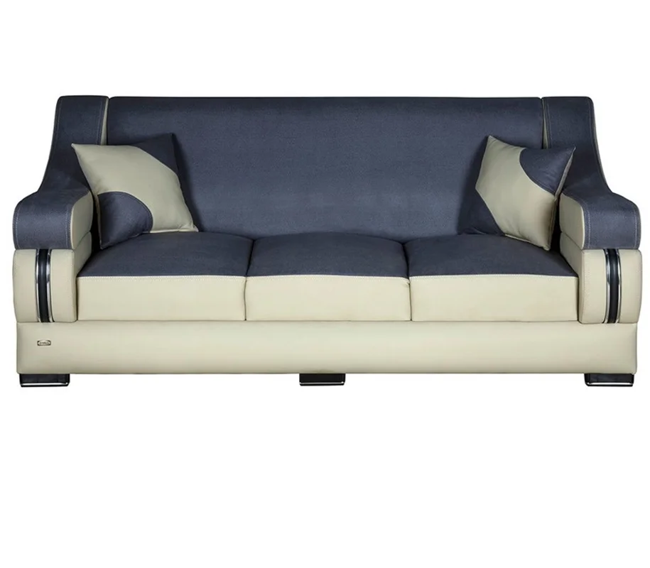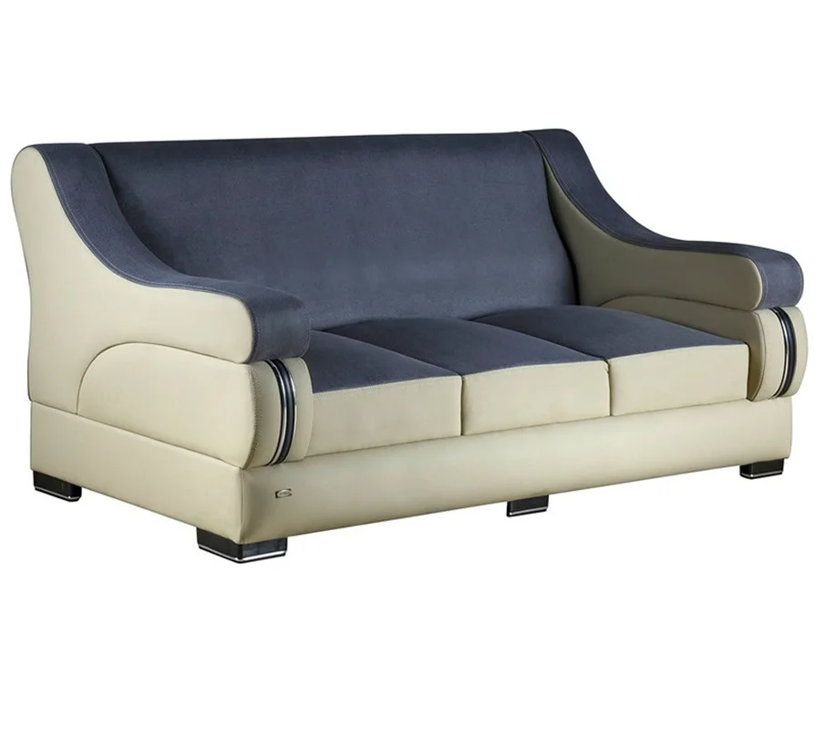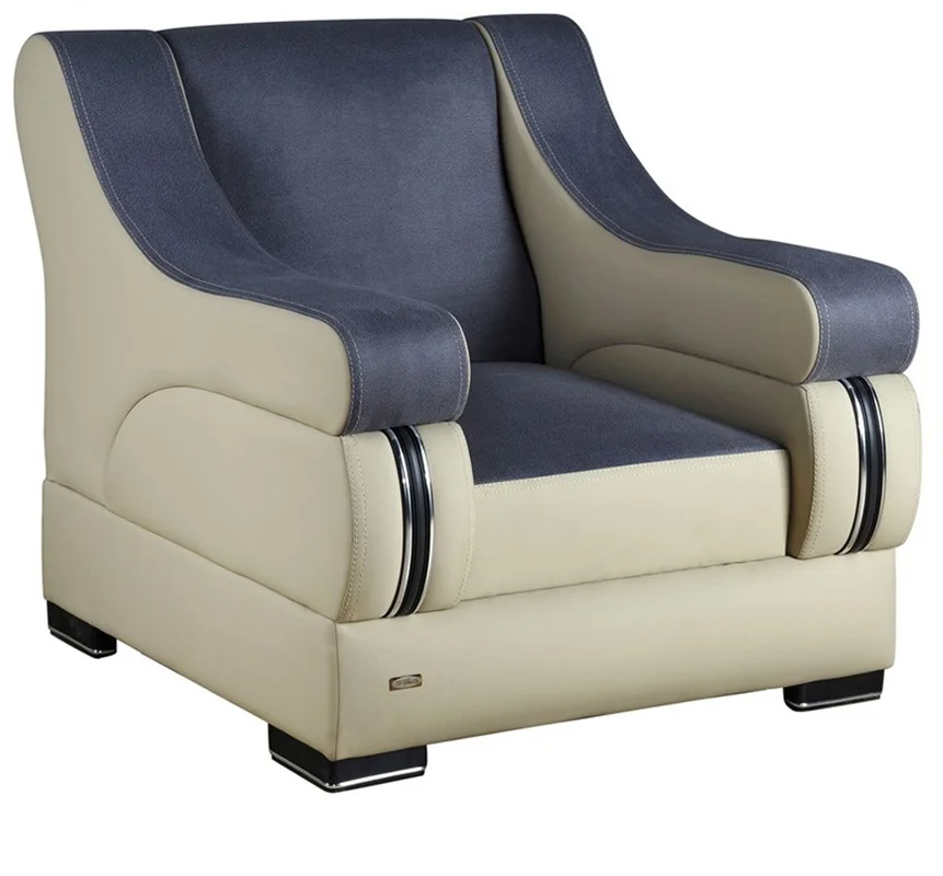 مبل راحتی چهار نفره دارای طرح زیبا و مدرنی می باشد . کفی کار فنر کشی و تخته کشی و پشتی کار تخته کشی شده است و سبک کار اداری و رسمی است .با توجه به اینکه روی کار از چرم استفاده شده است پایه های کار پلیمر بوده و از دو پایه ی زاپاس در هر مدل در صورت آسیب دیدن کار تعبیه شده است از چرم بدن رویه کار باعث شده است که نظافت کار راحت تر باشد . روی دسته های کار شاسی کشی محکم جهت فشار آرنج یا حتی ایستادن روی دسته و ضربه خوردن انجام شده است در نمای کار از دوخت سوزنی برای زیبایی بیشتر استفاده شده است کفی کار بسیار راحت است و ارتفاع مناسب آن نسبت به سطح زمین باعث میشود نشست و برخواست راحت تر انجام گیرد . کاناپه ی سه نفر آن دارای دو عدد کوسن تزیینی می باشد که ترکیب دو رنگ اصلی استفاده شده در بدنه مبل می باشد . کاناپه های سه نفره در عکس هم کاملا مشخص هست طبق استاندارد جهانی پایه های کمکی دارند یعنی هر کاناپه بجای ۴تا پایه روی ۶تا پایه بنا شده و از استحکام کامل برای نشیمن برخوردارهست. کفی کار به راحتی جدا میشود و با کمک زیپ در زیر کفی می توان روکش آنرا جدا کرد و شستشو داد و همچنین رویه ی کار را میتوان با مقداری شامپو فرش یا شامپوی مخصوص شستشوی مبل تمیز کرد و به زیبایی روز اول میشود .رنگ سورمه کرم این کار را می توان با هر دکوراسیون و یا حتی مبل های دیگر به راحتی ست کرد و از ترکیب آن لذت برد