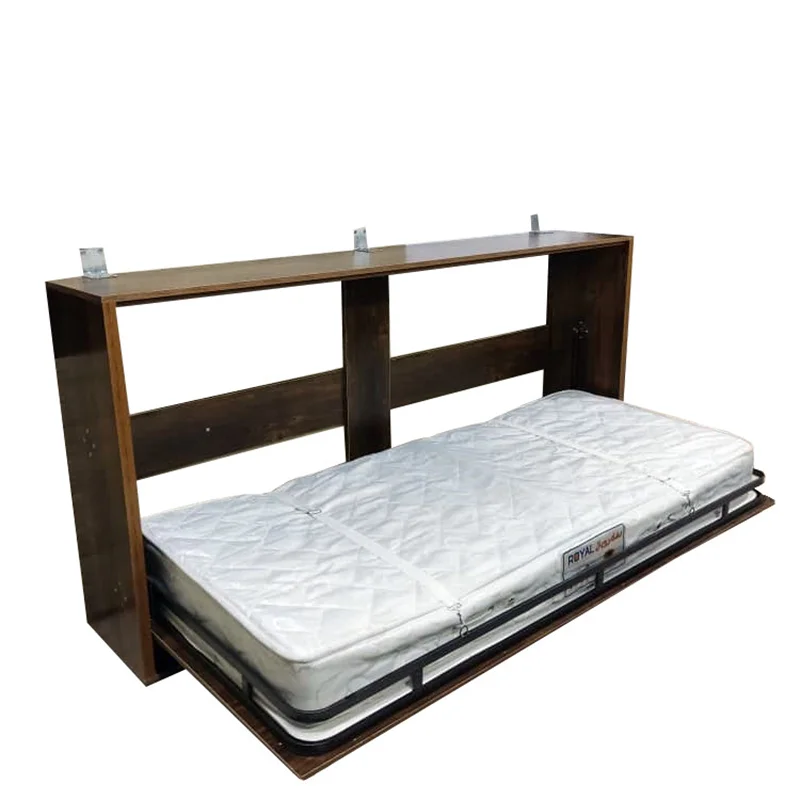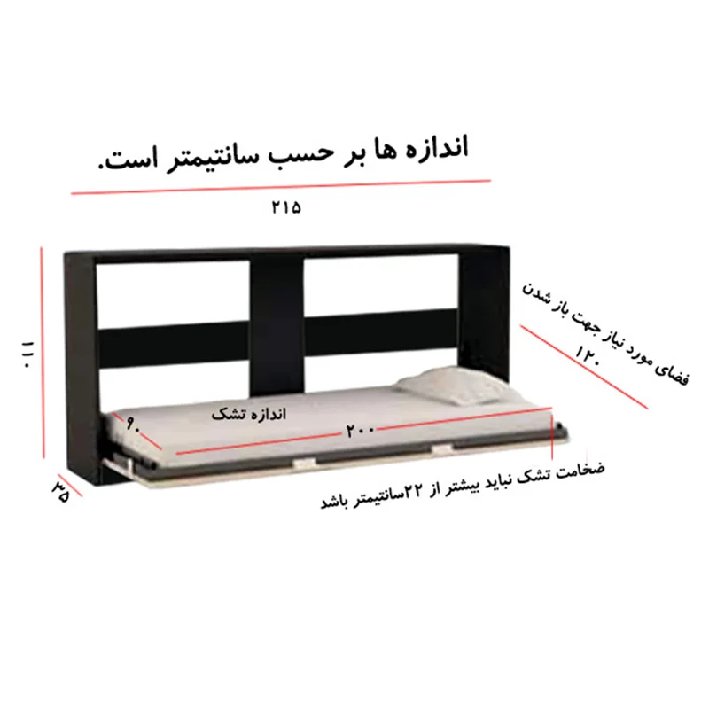 تخت خواب تاشو یکنفره مدل DLF65L، ابعاد و اندازه های مورد نیاز برای نصب این سرویس کمجا 215در110در35 سانتیمتر است، این تخت خواب تاشو افقی تشک تکنفره 200در90 سانتیمتر را در خود جای میگیرد. در صورت خرید تختخواب تاشو مدل DLF65L تشک را باید خودتان تهیه کنید و تشک نباید بیشتر از 22سانتیمتر ضخامت داشته باشد، با توجه به استفاده چند منظوره و کارایی بالا مکانیزم این نوع تختخواب به این صورت است که تخت توسط یک کلاف و یراق فلزی حول یک محور تا زاویه 90 درجه میچرخد و تمام سیستم تختخواب و تشک را روی دیوار قرار میدهد تا فضای خانه باز شود. این مدل تخت برای گردش حول محور دارای جک هیدرولیک است که بدون نیاز به نیروی زیاد باز و بسته شود، بعد از جمع شدن یا در واقع سوار شدن بر دیوار تخت فضای زیر آن آزاد می شود و در مواقع نیاز به راحتی می توان تخت را باز کرد و استفاده نمود. جنس این تخت لترون ملامینه و فلز است و برای خرید جنس ام دی اف و یا ابعاد دیگر میتوانید مدلهای دیگر دلفان دکور را ببینید. ضمنا دقت کنید در صورت خرید تختخواب تاشو مدل DLF65L تشک را باید خود شما تهیه کنید و تشک نباید بیشتر از 20سانتیمتر ضخامت داشته باشد و طول تشک 200سانتیمتر و عرض تشک 160سانتیمتر باشد. لطفا برای انتخاب رنگ دلخواه سمپل رنگ را در تصاویر بررسی کنید.