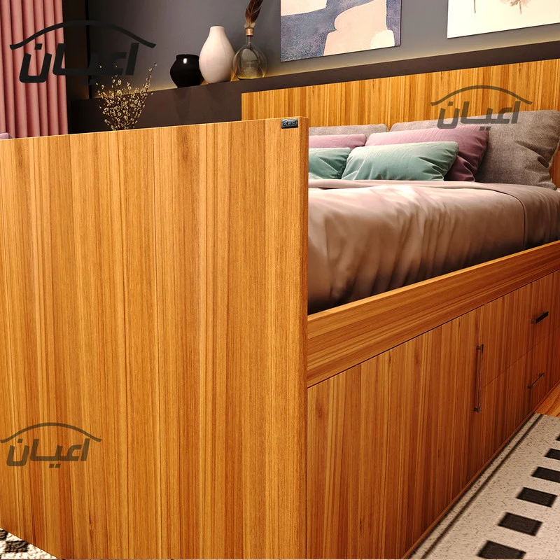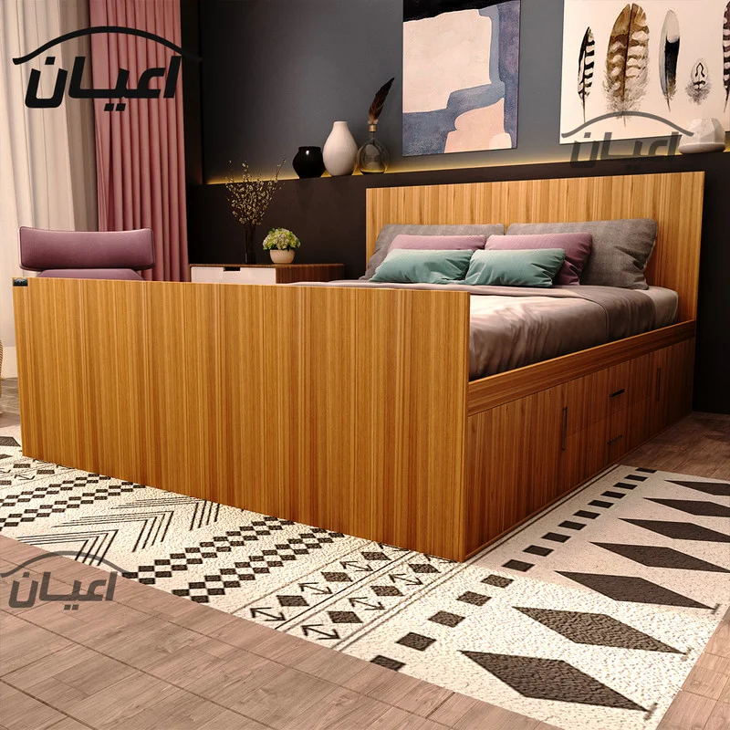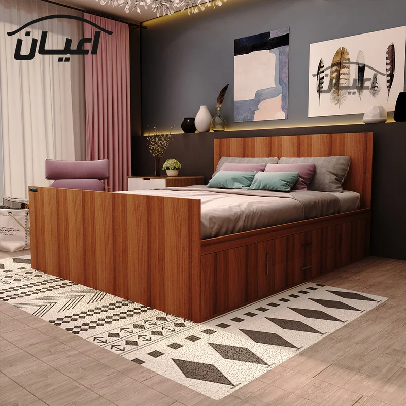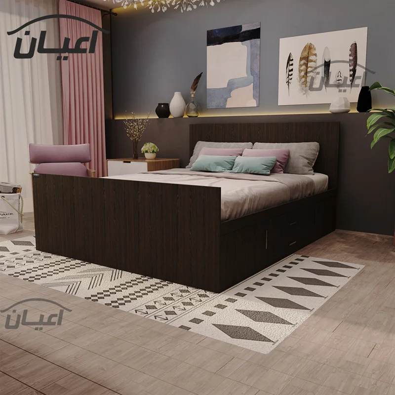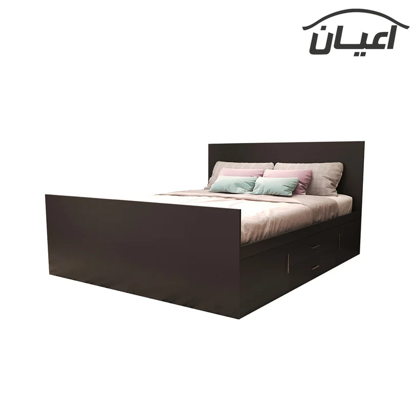 تخت خواب دونفره اعیان-طراحی ساده و کاربردی-تحمل وزن متناسب با ابعاد و استانداردها می باشد-مناسب تشک 160x200سانت.در رنگ های متنوع که در آلبوم کالا قابل مشاهده است-دارای 2کشو با ریل سه تکه و دارای دو درب کمدی .جنس ملامینه. بسته بندی با لوگو و برند اعیان.هنگام خرید و دریافت کالا به بسته بندی و لوگوی برند اعیان دقت فرمایید.