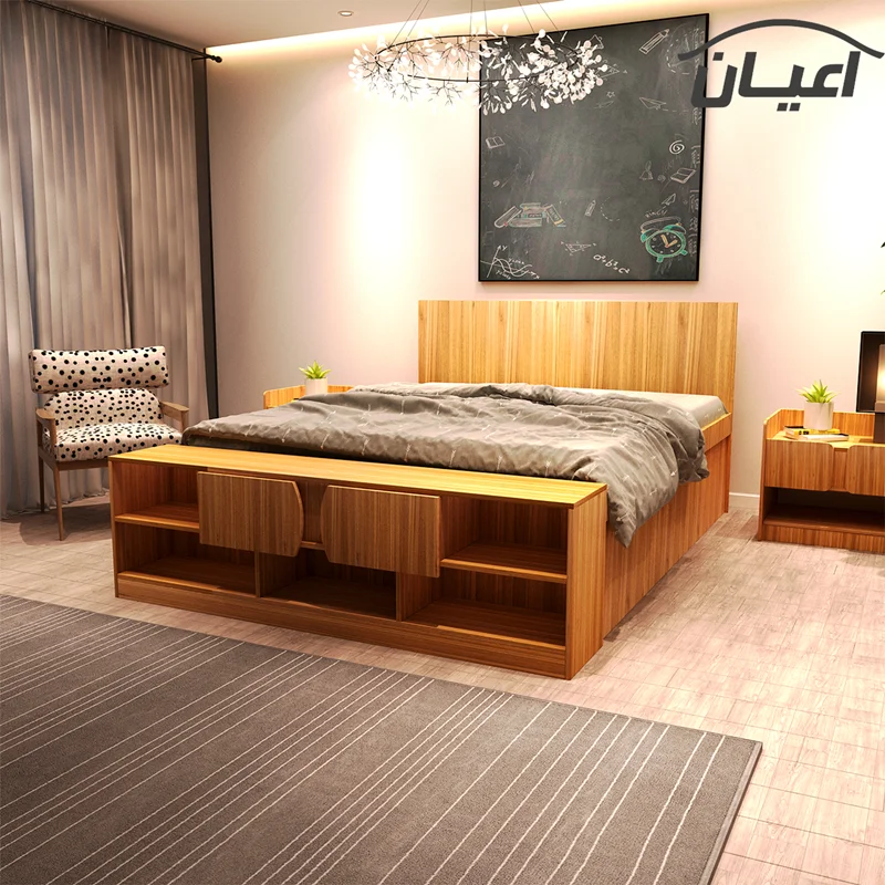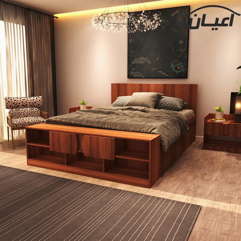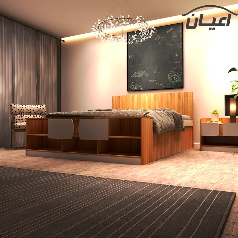 تخت خواب دونفره اعیان-جنس ملامینه .طراحی ساده و کاربردی-تحمل وزن متناسب با ابعاد و استانداردها می باشد-مناسب تشک 160x200سانت.در رنگ های متنوع که در آلبوم کالا قابل مشاهده است-دارای دو درب کمدی .و دارای فضای مجزای کتابخانه. بسته بندی با لوگو و برند اعیان.هنگام خرید و دریافت کالا به بسته بندی و لوگوی برند اعیان دقت فرمایید.
