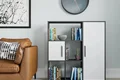کتابخانه مدل 5441 جنس روکش از ملامینه درجه یک میباشد و درب ها دارای لولای آرام بند با کیفیت میباشند و این کالا از استحکام و مقاومت بالایی برخوردار است و در رنگ بندی های زیبا و شکیل میباشد. چند رنگ شامل بدنه دودی و درب های سفید میباشد.
