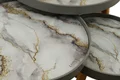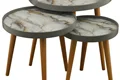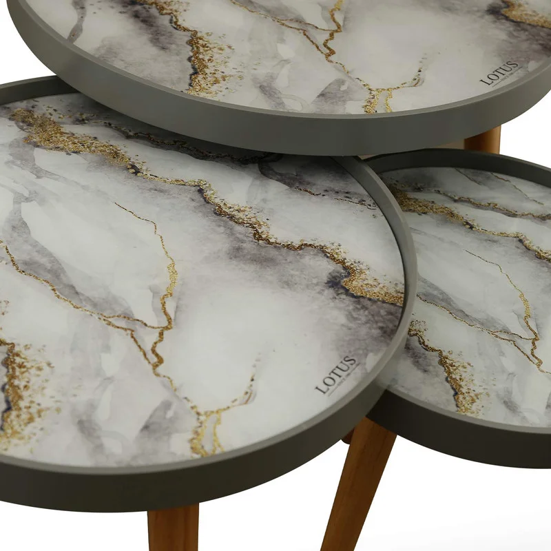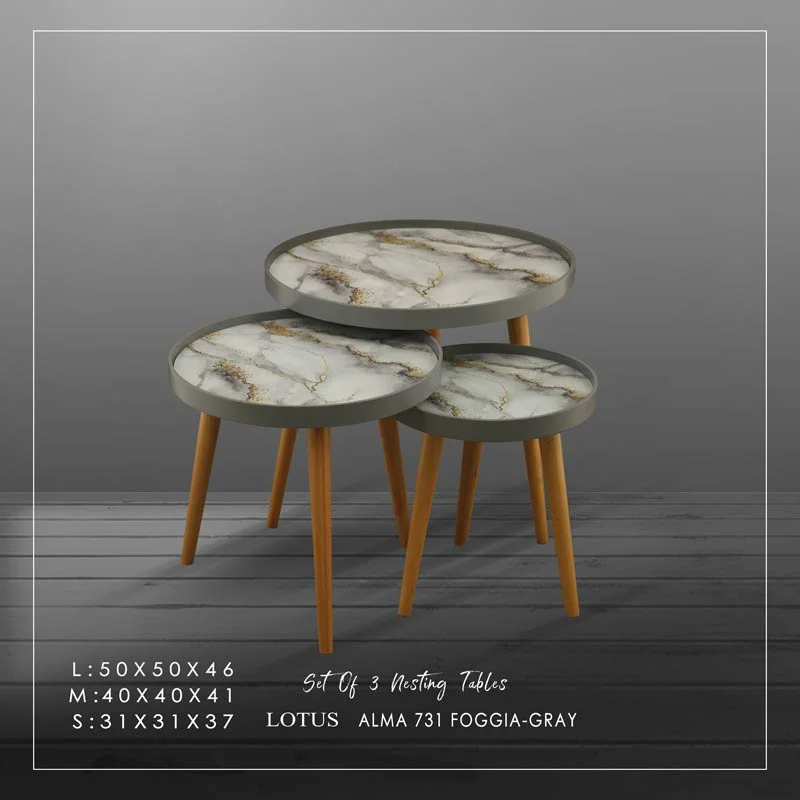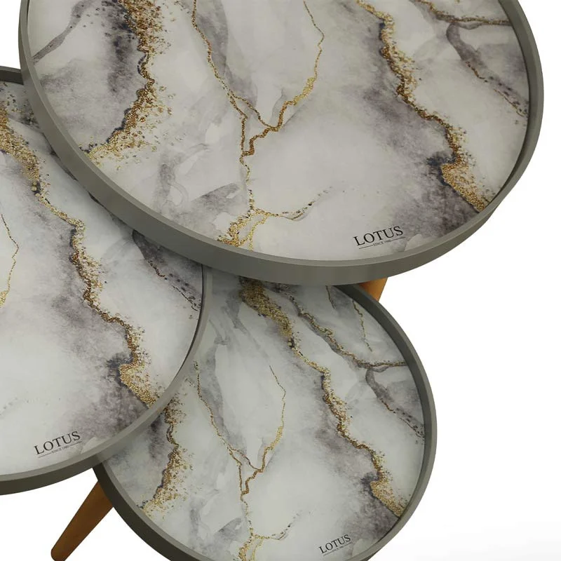میز عسلی سه تکه مدل ALMA طرح FOGGIA، دارای شیشه متحرک و چاپ مستقیم روی شیشه است.به همین دلیل سبب می شود طرح روی شیشه همیشه ماندگار و با کیفیت بماند. همچنین میز عسلی سه تکه FOGGIA دارای پایه های پیچی چوبی است. میز عسلی از جمله لوازم کاربردی و دکوراتیو برای منازل است. میز عسلی یکی از وسایلی است که با صرف کمترین هزینه ایده های زیادی برای دکوراسیون به شما می دهد.به این شکل که با قرار دادن در جلو مبل میتواند به فضا نظم دهد. همچنین می توانید با میز عسلی سه تکه فضای پذیرایی خود را تزیین نمایید. لوتوس میز عسلی مدل ALMA و مدل های دیگر را در طرح های مختلف تولید می کند،