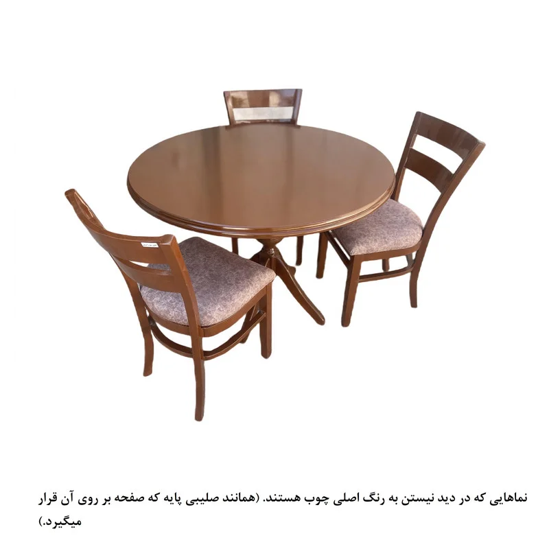ابعاد میز: قطر میز ۹۰ الی ۱۰۰ سانتی متر | اتصالات بسیار محکم | جدابودن صفحه میز از پایه برای راحتی در حمل و نقل | دارای صفحه موجدار شکیل و زیبا(طرح اصلی چوب) | صفحه میز روکش چوب راش | پایه ها دارای موج (طرح اصلی چوب)