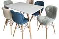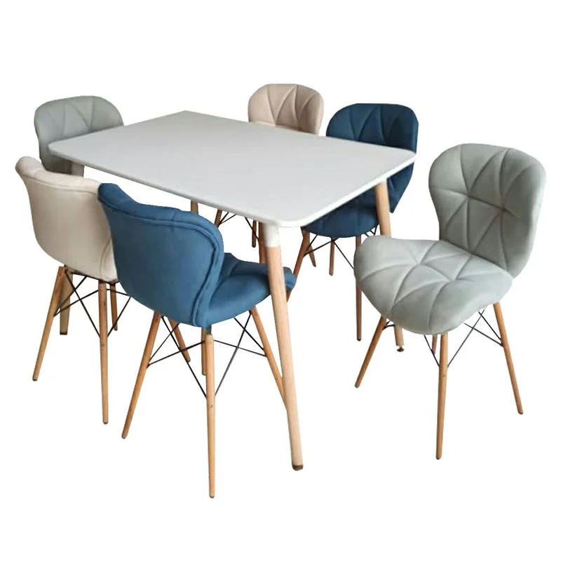 ابعاد میز80x120رویه میز Mdf و دارای 6عددصندلی در 3رنگ 2عددطوسی-2عددسرمه ایی-2عددکرم میباشد که رویه صندلی از پارچه مازراتی میباشد تحمل وزن صندلی تا 110کیلو میباشد