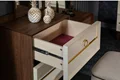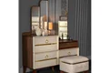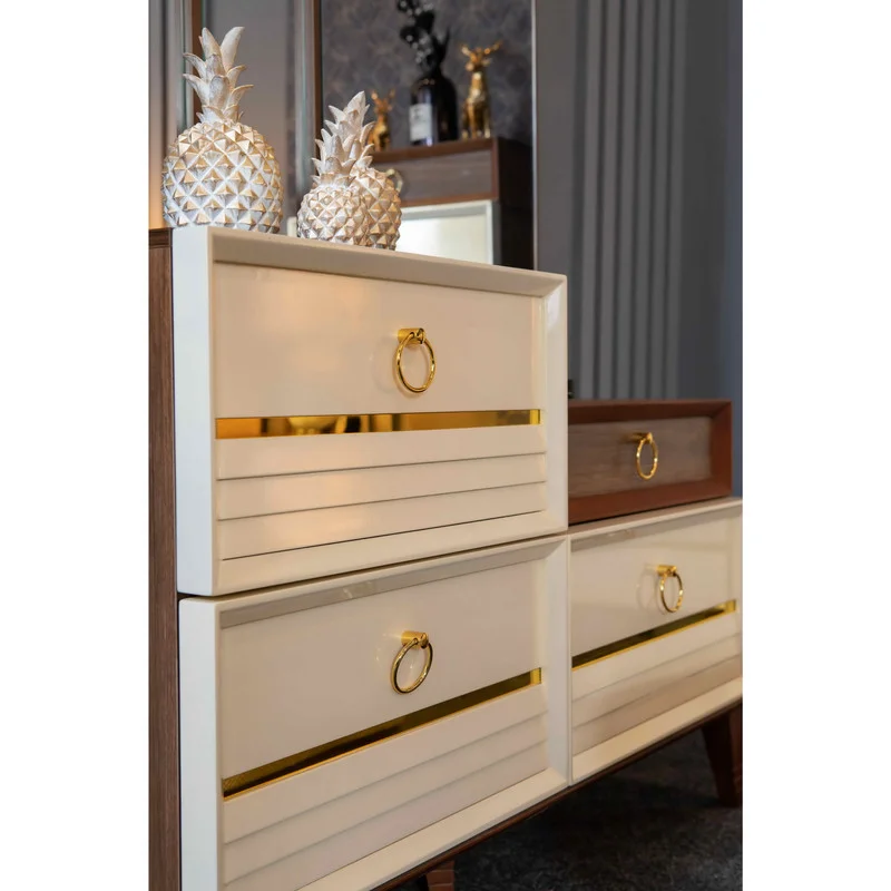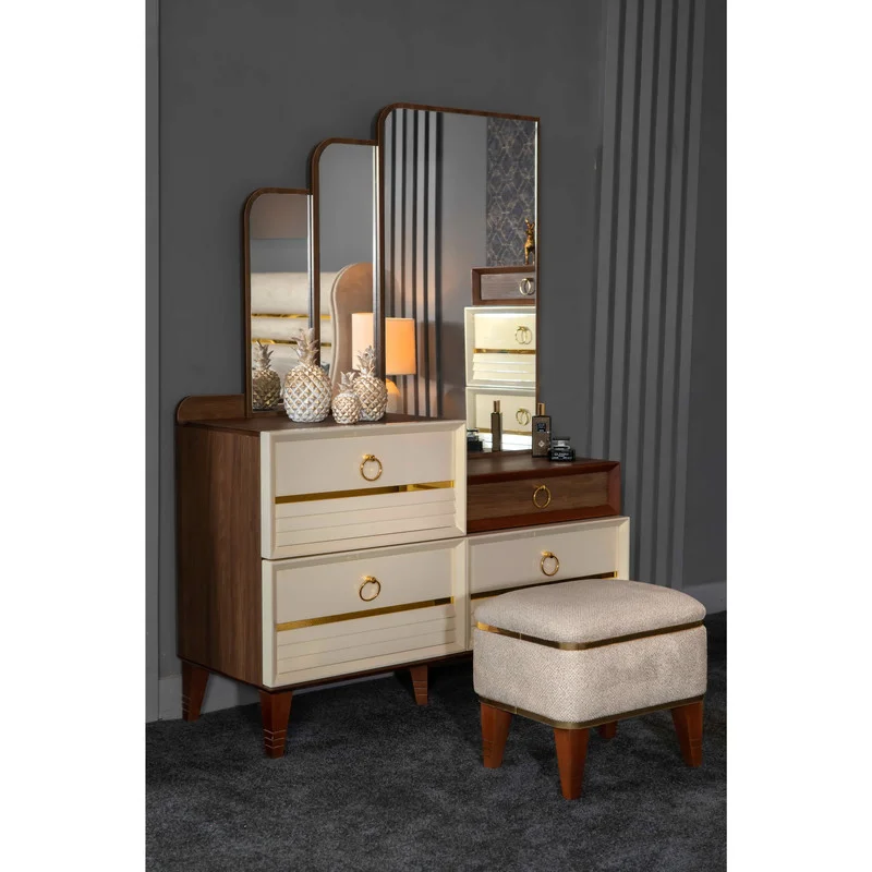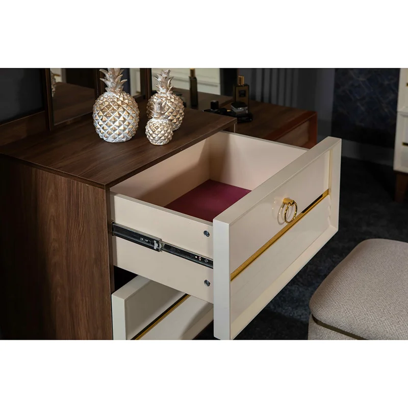 اگر یک میز آرایش خاص، زیبا، با کیفیت و با کارایی بالا نیاز دارید، در انتخاب میز آرایش آرنا کد 205 تردید نکنید. این میز آرایش تمامی مشخصات و قابلیت های یک میز آرایش و دراور را در خود گنجانده است. میز آرایش کد 205 از تلفیق چوب سوپر راش گرجستان، ام دی اف واناچای تایلندی و رنگ پلی اورتان والرسای اسپانیایی، به صورت کاملا مهندسی طراحی و تولید شده است. این میز آرایش دارای 3 کشوی بزرگ و جادار و یک کشوی متوسط می باشد. کف کشو های ای میز آرایش از جنس ام دی اف 6 میل متری می باشد که توسط پیج داخل شیاری که در داخل دیواره ی کشو طراحی شده است بسیار مستحکم شده است و استقامت بالایی برای تحمل وزن اشیا نسبتا سنگین دارند.. کف تمامی کشو ها به زیبایی و ظرافت خاصی مخمل پاشی شده است. میز آرایش کد 205 دارای یک آینه 3 تیکه بسیار خاص و جذاب است که از بهترین نوع کیفیت برخوردار است و دور تا دور آن تراش خورده است که زیبایی این میز آرایش را تکمیل می کند. بر روی درب کشو های این میز آرایش شیارهایی طراحی شده است که یک پلکسی طلایی رنگ آینه ای داخل آن قرار گرفته است تا جلوه ی خاص و چشم نوازی به این میز آرایش بدهد. متریال استفاده شده در این میز آرایش از بهترین مواد اولیه وارداتی تهیه شده است که عبارتند از: چوب راش گرجستان، ام دی اف وااناچای تایلند، رنگ پلی اورتان والرسای اسپانیایی، ریل و یراق آلات وارداتی، اتصالات الیت و ...