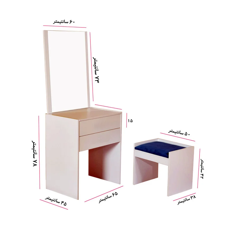 دارای دو عدد کشو ریل ساچمه ای دارای آینه صادراتی درجه یک لبه های میز نوار پی وی سی جنس ام دی اف درجه یک