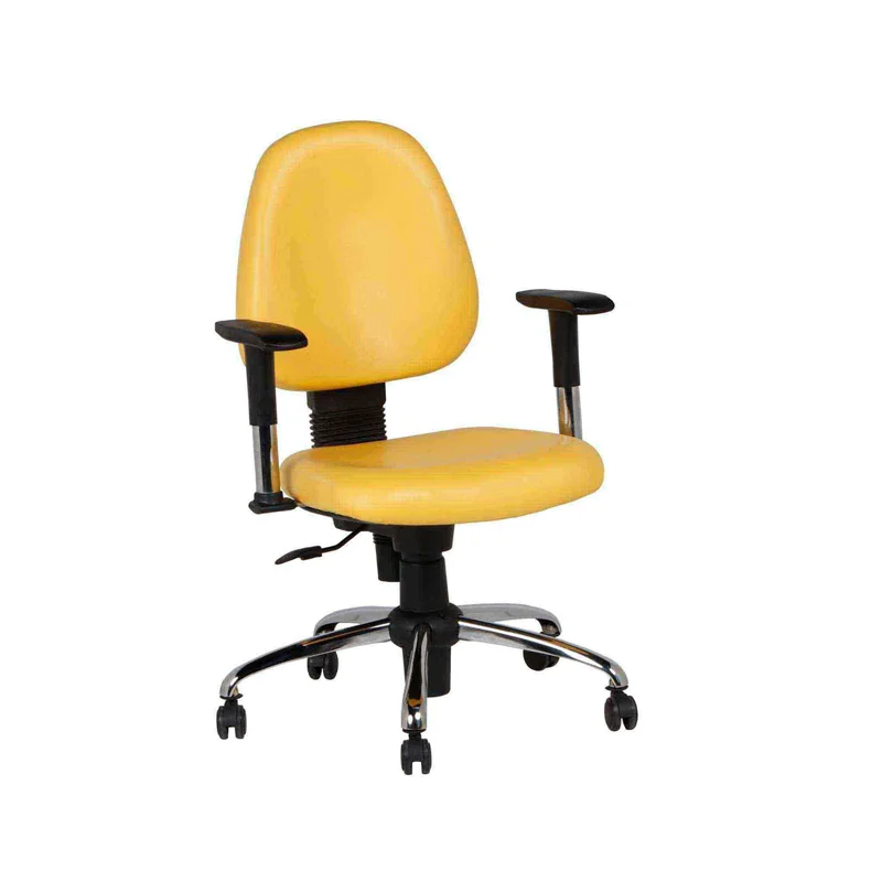 صندلی اداری با طراحی مدرن و جمع و جور.پایه پنج پر فولادی با ابکاری کروم و چرخ های ژله ای .نشیمن راحت و جک گازی 12 سانتی کتری با دسته های فولادیابکاری شده کروم با پد نرم انتگرال و قابلیت تنظیم ارتفاع دسته ها